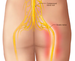 bolečina, ki se začne v križu in širi v zadnjico ter po nogi navzdol,